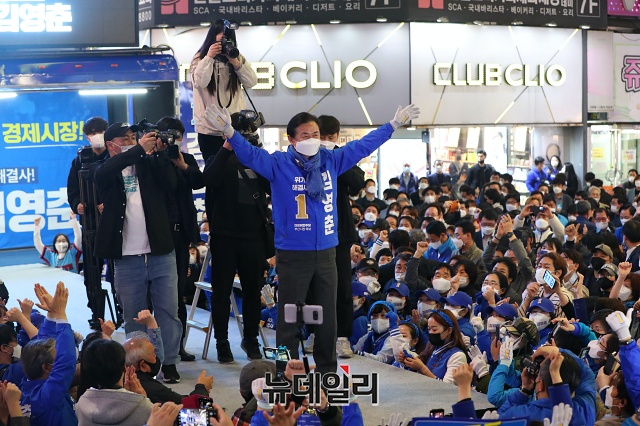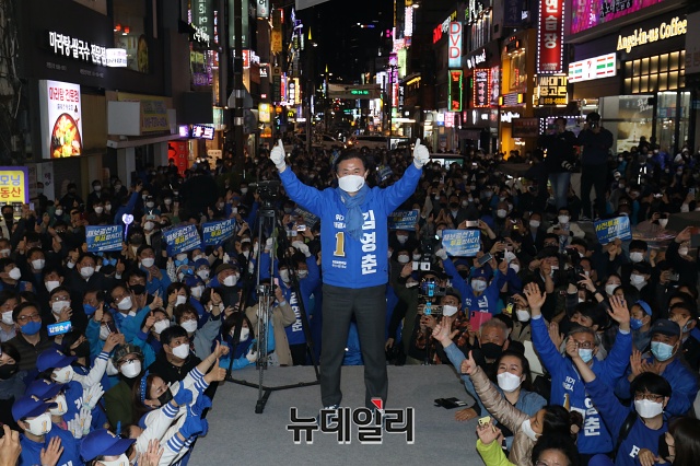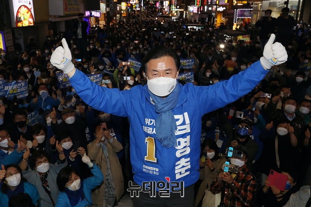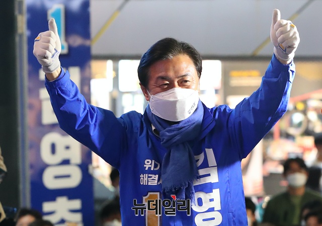 김영춘 더불어민주당 부산시장 후보가 6일 오후 부산 부산진구 서면역 인근에서 유세차량에 올라 기념촬영을 갖고 있다. (부산=권창회 기자)