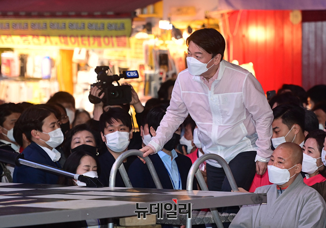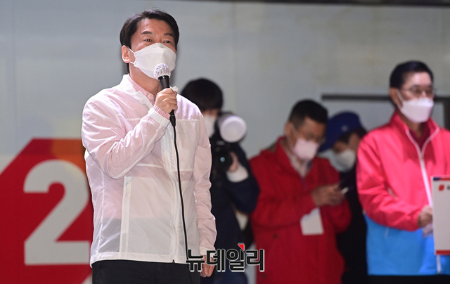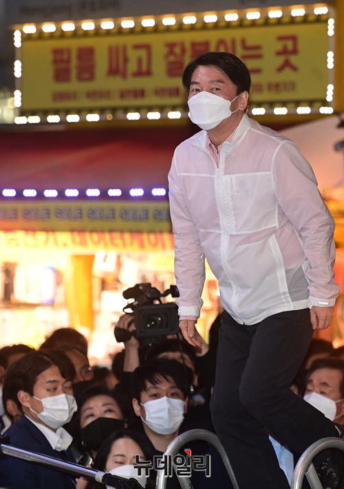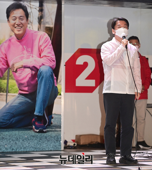 안철수 공동선대위원장이 선거유세 마지막 날인 6일 오후 서울 서대문구 신촌에서 열린 오세훈 서울시장 후보의 파이널 유세에 참석해 인사하고 있다.