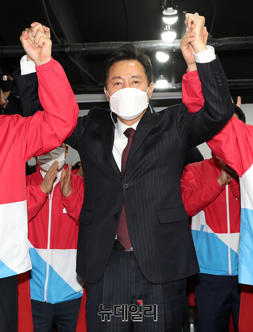 [포토] 환호하는 오세훈 국민의힘 서울시장 후보