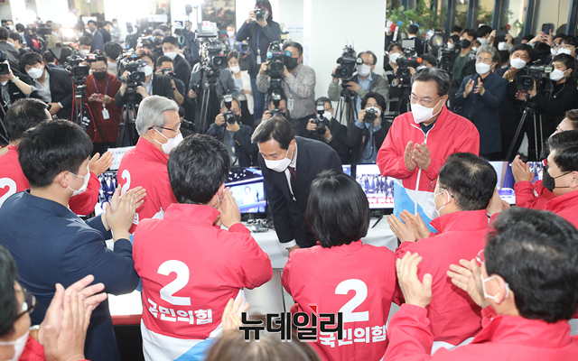 오세훈 국민의힘 서울시장 후보와 김종인 국민의힘 비상대책위원장 및 당원들이 7일 오후 서울 여의도 국민의힘 중앙당사에 마련된 개표상황실에서 출구조사 결과를 확인하고 환호하고 있다. (사진=국회사진공동취재단)