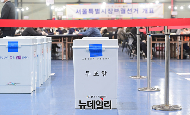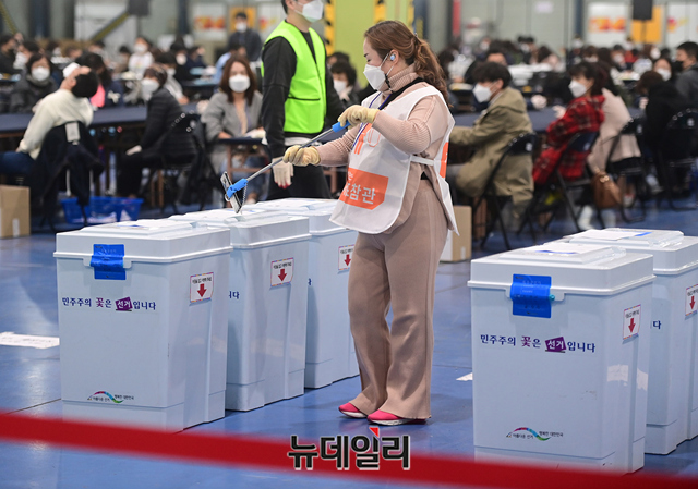 4.7재보궐선거 개표 참관인이 선거일인 7일 오후 서울 강남구 세텍에 마련된 개표소로 들어온 투표함의 봉인을 확인하고 있다.