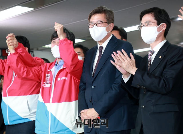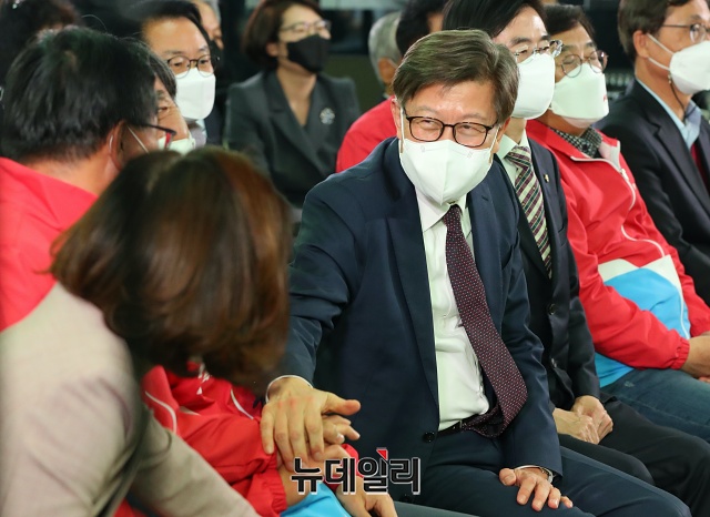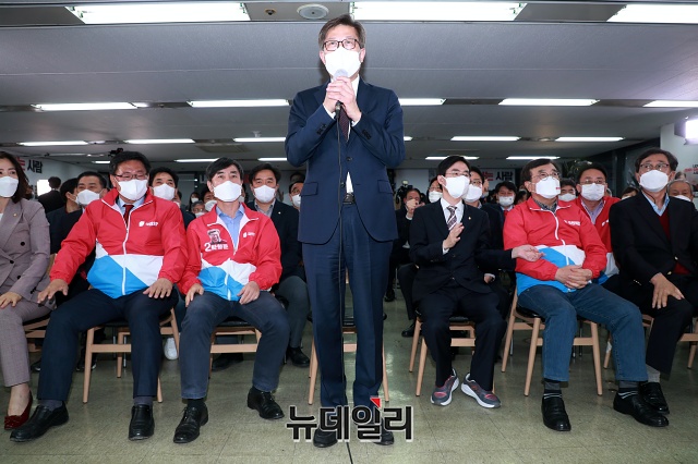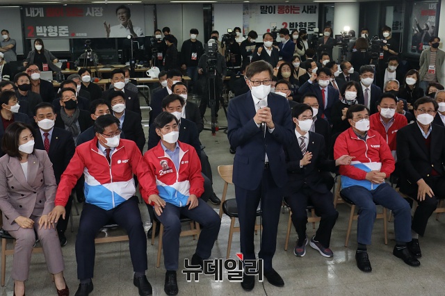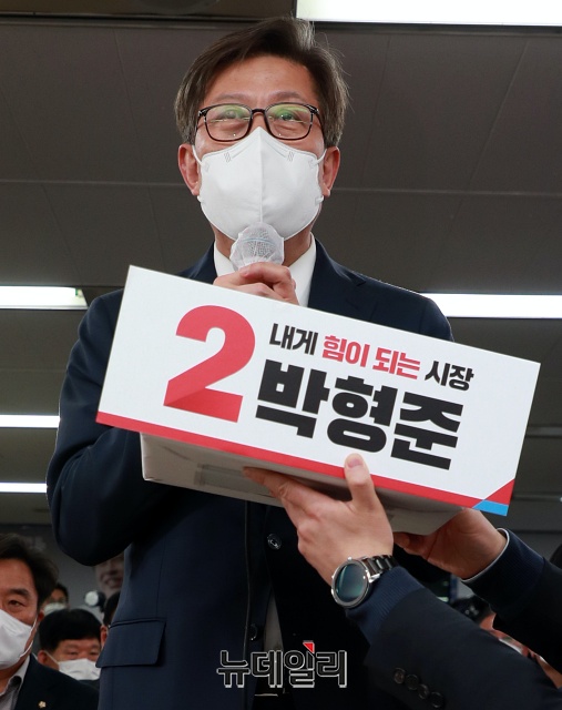 박형준 국민의힘 부산시장 후보가 7일 오후 부산 부산진구 박형준 선거사무소에서 출구조사 결과를 확인하고 발언하고 있다. (부산=권창회 기자)