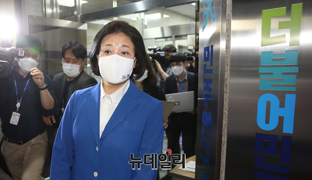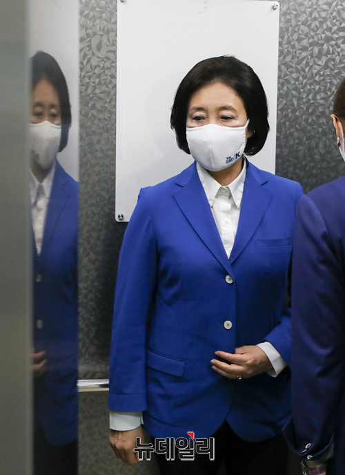 4.7 재보궐선거 출구조사 결과 오세훈 국민의힘 서울시장 후보가 당선이 유력해진 7일 오후 서울 여의도 더불어민주당사에 박영선 후보가 들어서고 있다. (사진=국회사진공동취재단)