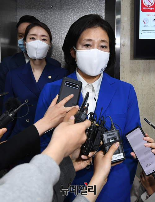 4.7 재보궐선거 출구조사 결과 오세훈 국민의힘 서울시장 후보가 당선이 유력해진 7일 오후 서울 여의도 더불어민주당사를 찾은 박영선 후보가 기자들의 질문에 답하고 있다. (사진=국회사진공동취재단)