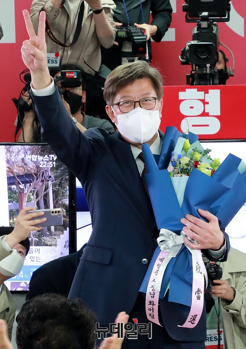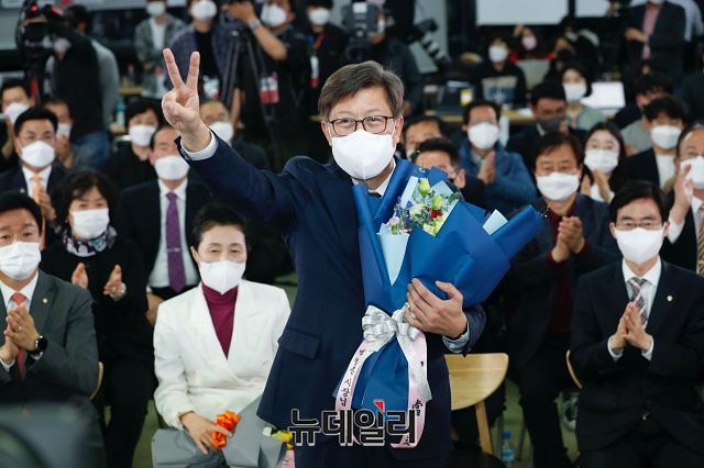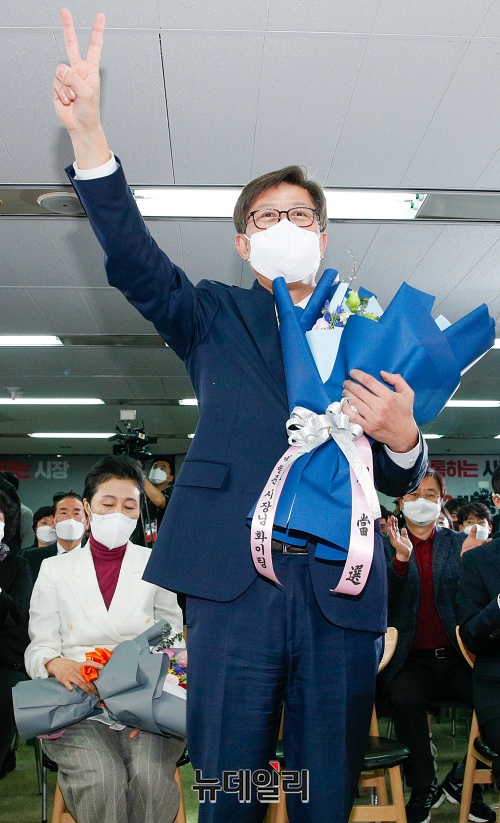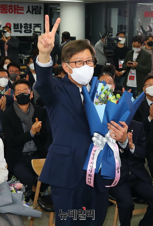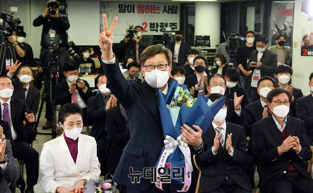박형준 국민의힘 부산시장 후보가 7일 밤 부산 부산진구 박형준 선거사무소에서 당선이 확실시되자 축하꽃다발을 받고 기념촬영을 갖고 있다. (부산=권창회 기자)