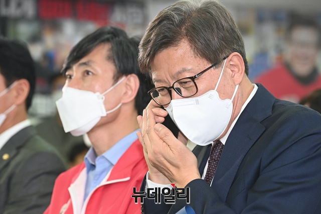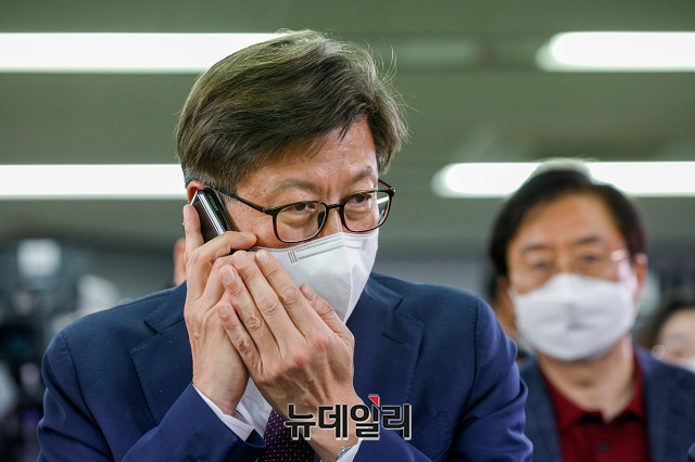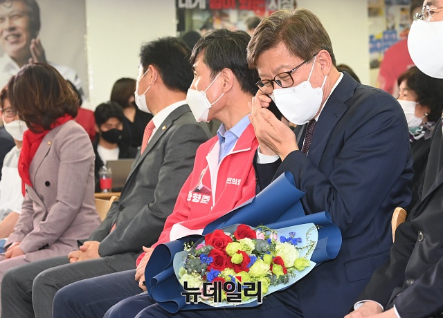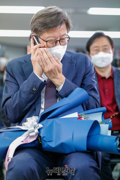 박형준 국민의힘 부산시장 후보가 7일 밤 부산 부산진구 박형준 선거사무소에서 김영춘 더불어민주당 부산시장 후보의 축하 전화를 받고 있다. (부산=권창회 기자)