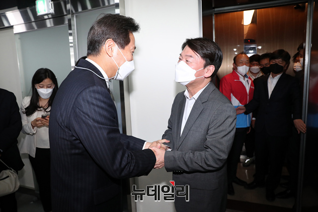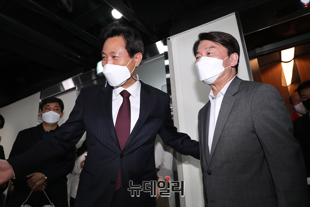 오세훈 국민의힘 서울시장 당선인이 8일 오전 서울 여의도 국민의힘 중앙당사에 마련된 개표상황실에서 안철수 국민의당 대표를 맞이하며 포옹을 하고 있다. (사진=국회사진공동취재단)