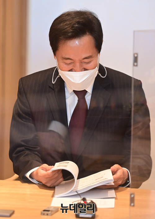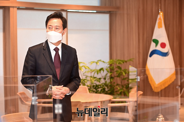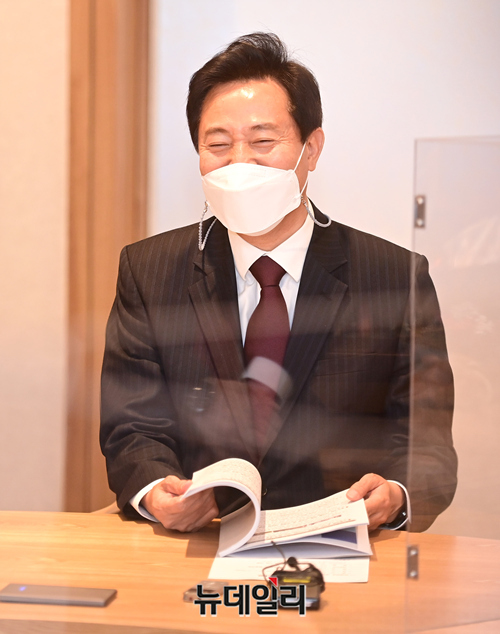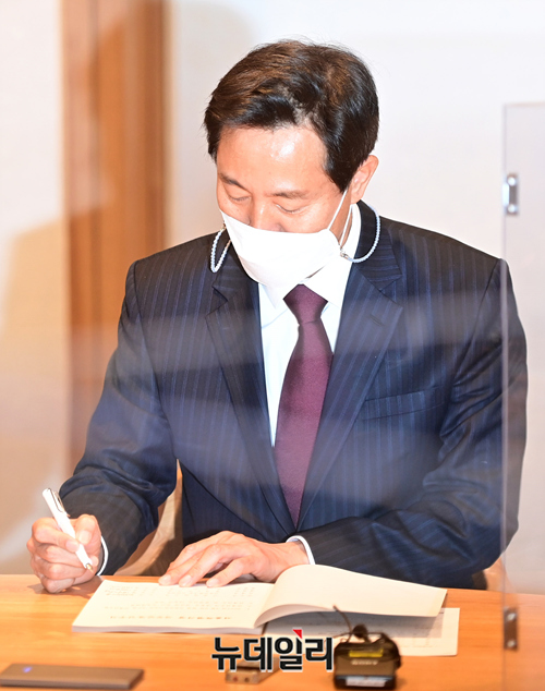 오세훈 서울시장 당선인이 8일 오전 서울 중구 서울시청 6층 집무실에서 사무 인계인수 책자에 서명을 하고 있다. 이날 서명한 책자는 3권이다.