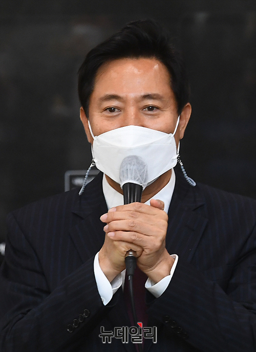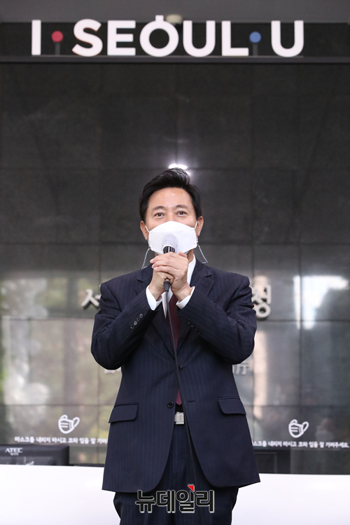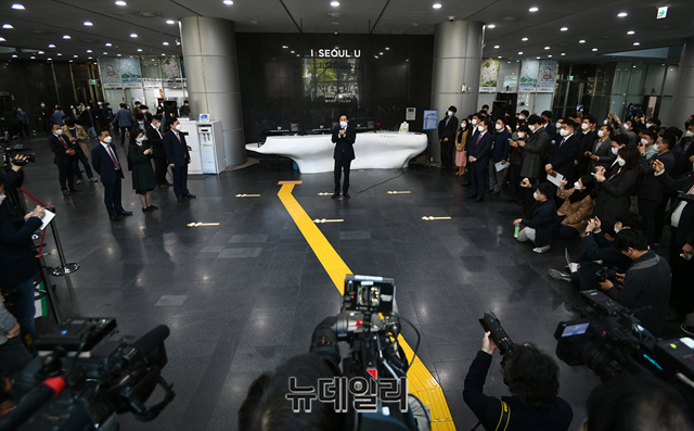 제38대 서울특별시장에 당선된 오세훈 시장이 8일 오전 서울 중구 서울시청으로 첫 출근하며 인사말을 하고 있다. 이후 오 시장은 6층에 마련된 시장 집무실에서 사무 인계인수 책자에 서명을했다. (사진=공동취재단)