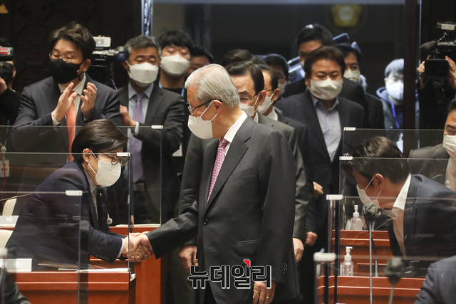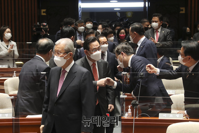 김종인 국민의힘 비상대책위원장과 주호영 원내대표 등이 8일 오전 국회에서 열린 의원총회에 박수를 받으며 입장하고 있다. (사진=국민의힘)