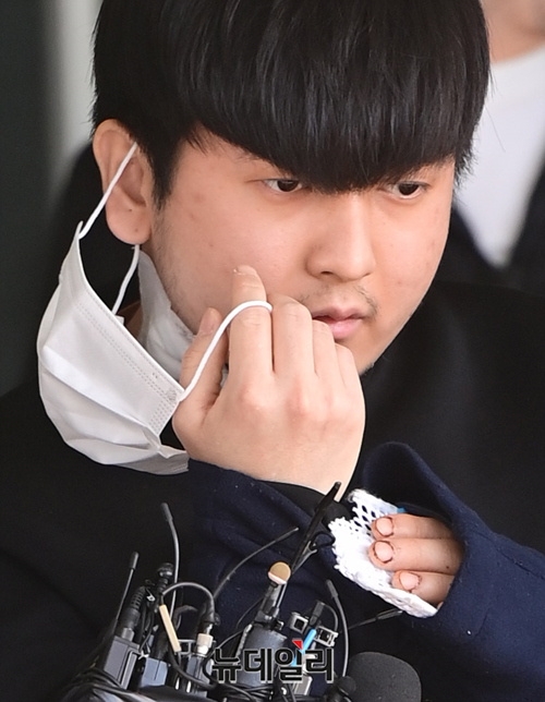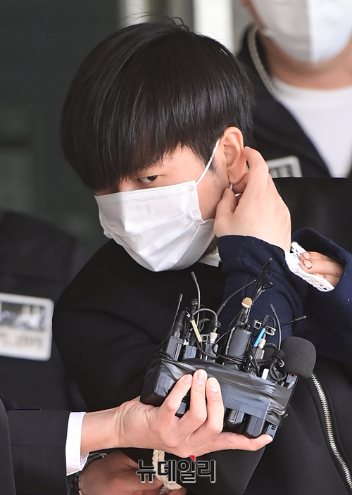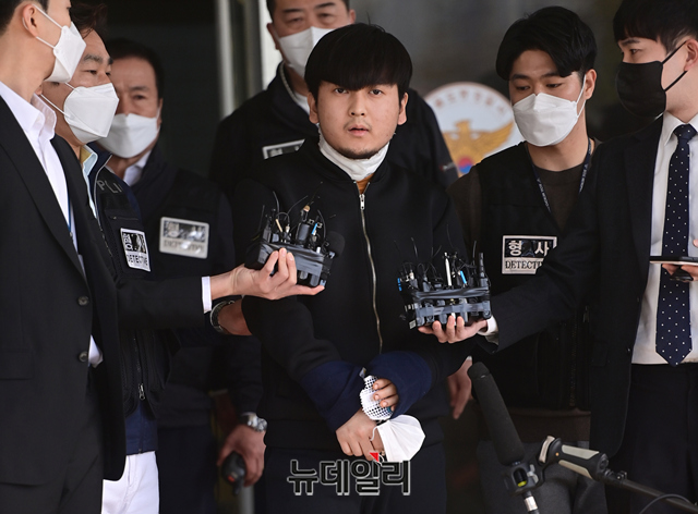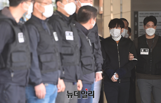 노원구 세 모녀를 살해한 혐의를 받는 김태현이 9일 오전 서울 도봉경찰서 유치장에서 나와 검찰로 송치되기 전 언론에 얼굴을 공개했다. 마스크를 쓰고 나온 김태현은 기자의 요구에 마스크를 스스로 벗었다.