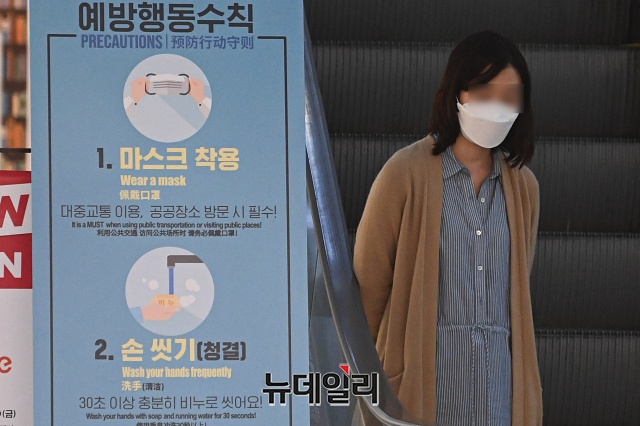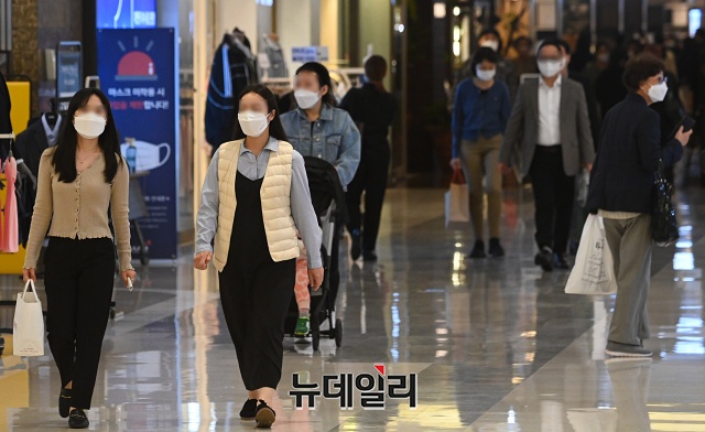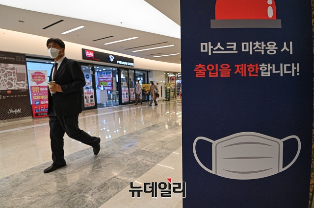 마스크 착용 의무화 조치가 시행되는 12일 오후 서울 강남구 코엑스에서 한 시민이 마스크를 착용하고 이동하고 있다.