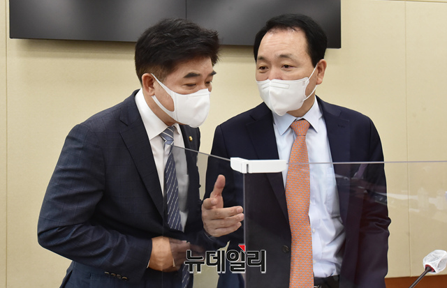 성일종 소위원장과 김병욱 더불어민주당 의원이 13일 오전 국회에서 열린 이해출동방지법안 관련 정무위원회 법안심사제2소위원회 회의에 앞서 대화를 나누고 있다. (사진=공동취재단)