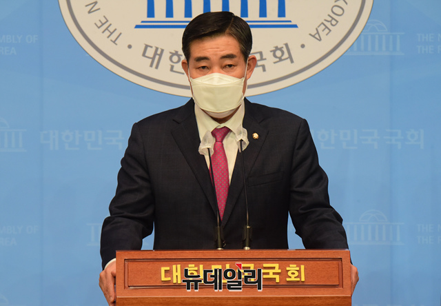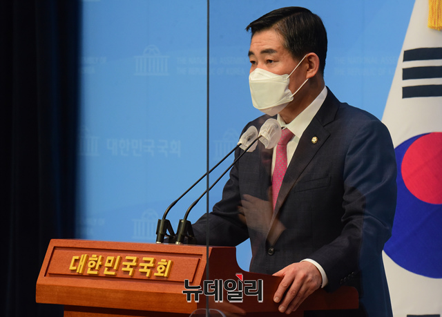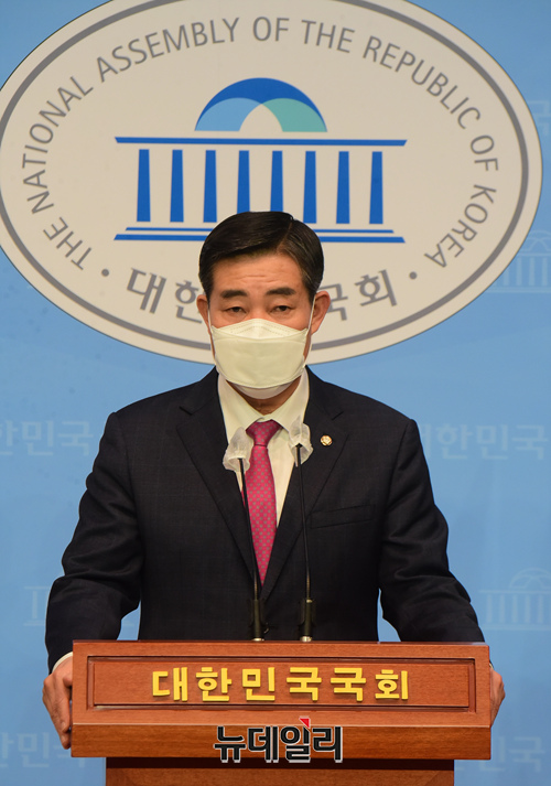 국민의힘 소속 신원식 국방위원회 위원이 13일 오후 국회 소통관에서 국민의힘 국방위원들의 행정안전부 '전시상황 대비 실제 훈련 촉구' 지지 성명을 발표하고 있다.