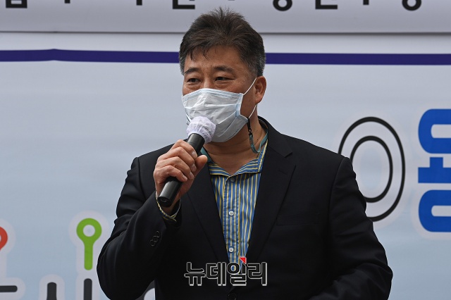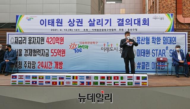 맹기훈 이태원관광특구연합회장이 13일 오후 서울 용산구 이태원 해밀톤호텔 인근 야외무대에서 열린 '이태원 상권 살리기 결의대회'에서 인사말을 하고 있다.용산구는 이태원 상권 활성화를 위해 △소상공인 재난위기 극복 지원 △용산형 착한 임대인 지원 △공실 활용 스타샵 프로젝트 △우리동네가게 아트테리어 △1부서 1경제살리기 △골목상권 활성화 △구청 주차장 24시간 개방 등 방안을 내놓을 예정이다.이날 행사에는 성장현 용산구청장, 맹기훈 이태원관광특구연합회장, 이상용 해밀톤호텔 회장, 이범우 이태원건물주회장, 김지송 서울신용보증재단 용산지점장 등이 참석했다.