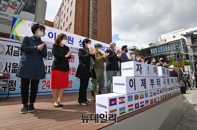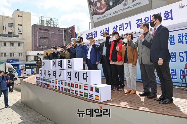 성장현 용산구청장을 비롯한 참석자들이 13일 오후 서울 용산구 이태원 해밀톤호텔 인근 야외무대에서 열린 '이태원 상권 살리기 결의대회'에서 이태원 활성화를 촉구하는 블록 퍼포먼스를 하고 있다.용산구는 이태원 상권 활성화를 위해 △소상공인 재난위기 극복 지원 △용산형 착한 임대인 지원 △공실 활용 스타샵 프로젝트 △우리동네가게 아트테리어 △1부서 1경제살리기 △골목상권 활성화 △구청 주차장 24시간 개방 등 방안을 내놓을 예정이다.이날 행사에는 성장현 용산구청장, 맹기훈 이태원관광특구연합회장, 이상용 해밀톤호텔 회장, 이범우 이태원건물주회장, 김지송 서울신용보증재단 용산지점장 등이 참석했다.