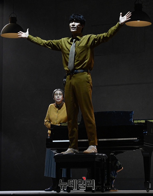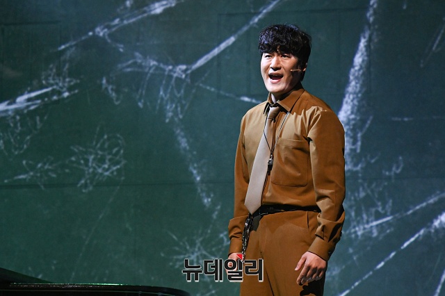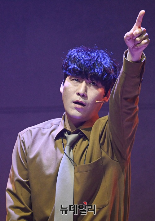 배우 정상윤이 13일 오후 서울 중구 정동극장에서 열린 뮤지컬 '포미니츠' 프레스콜에서 하이라이트 장면을 시연하고 있다.