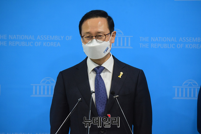 홍영표 더불어민주당 의원이 14일 오전 국회 소통관에서 당대표 출마선언을 마치고 기자들의 질문에 답하고 있다.