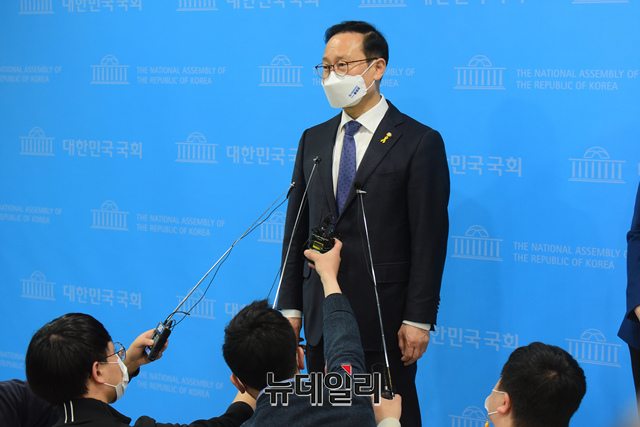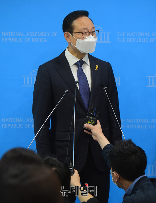 [포토] 기자들의 질문에 답하는 홍영표 의원