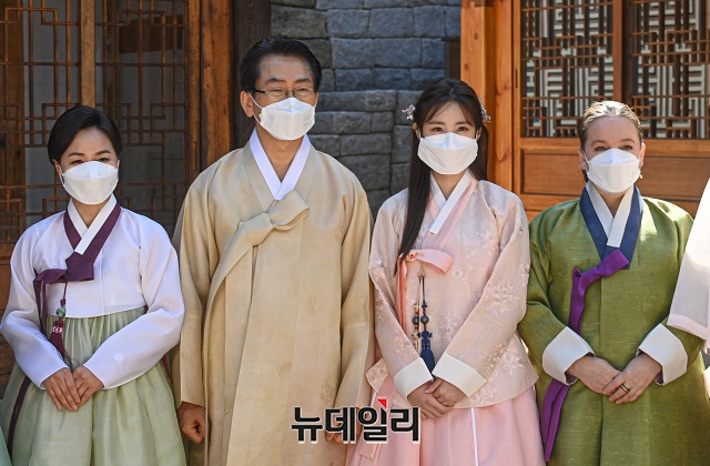김영종 종로구청장, 가수 전효성을 비롯한 참석자들이 14일 오후 서울 종로구 무계원에서 열린 '종로 한복 토크콘서트'에서 기념촬영을 갖고 있다.