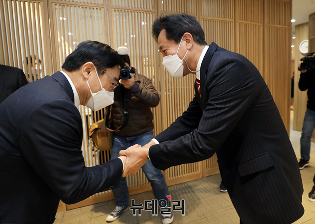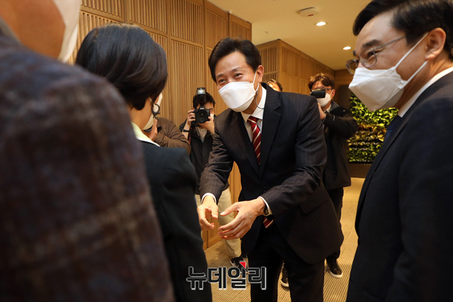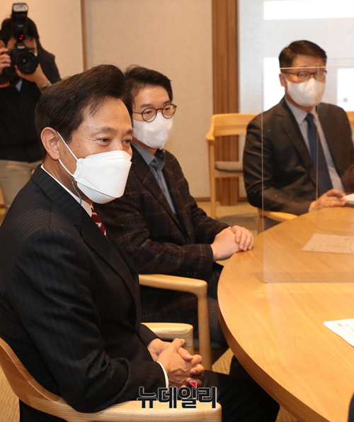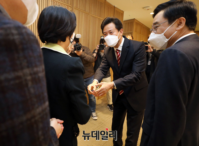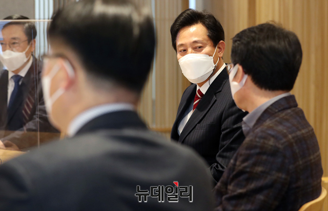 오세훈 서울시장이 14일 오후 서울 중구 서울시청 집무실에서 서울시구청장협의회 임원과 면담에 앞서 인사를 나누고 있다. 이날 면담에는 임원진인 이동진 도봉구청장, 김수영 양천구청장, 정원오 성동구청장이 참석했다.