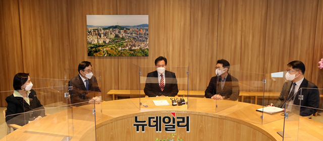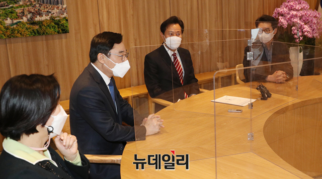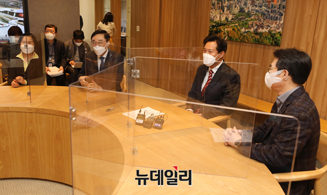 오세훈 서울시장이 14일 오후 서울 중구 서울시청 집무실에서 열린 구청장협의회와 상견례 자리에서 대화를 나누고 있다. 이날 면담에는 서울시구청장협의회 임원진인 이동진 도봉구청장, 김수영 양천구청장, 정원오 성동구청장이 참석했다.