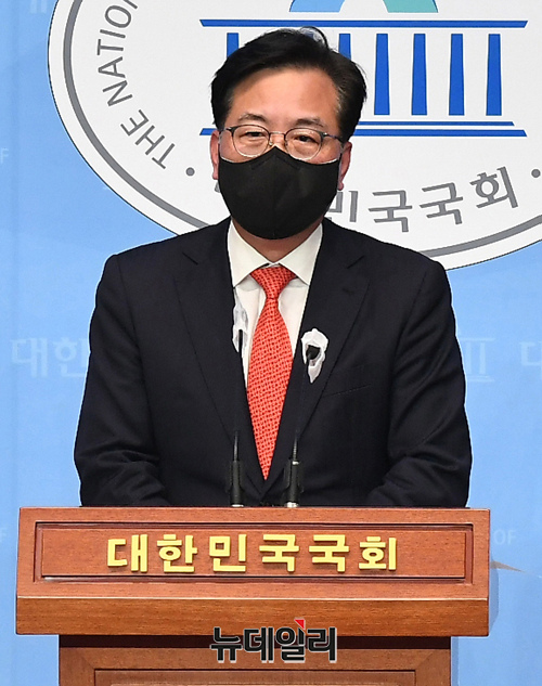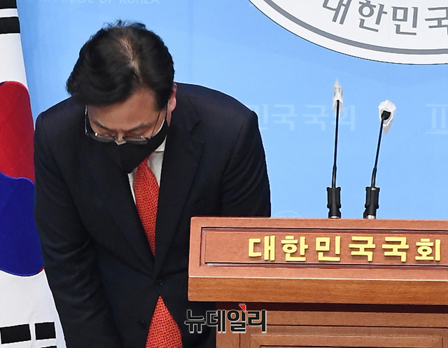 송언석 국민의힘 의원이 14일 오후 국회 소통관에서 기자회견을 갖고 탈당을 선언하고 있다. 송의원은 지난 4·7 재보궐선거 개표상황실에서 본인 자리가 마련되지 않았다는 이유로 당직자들에게 욕설 및 폭언, 발길질 등 폭행을 저지른 것으로 알려졌다.