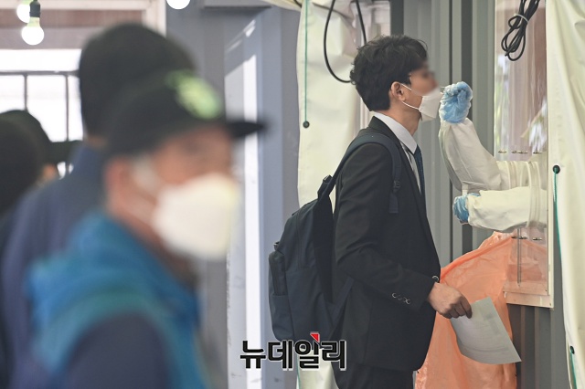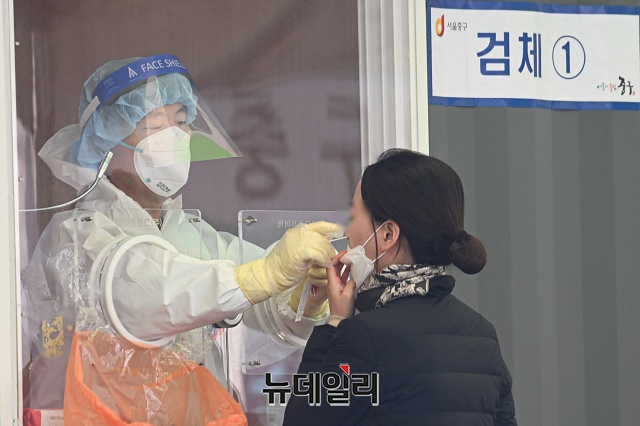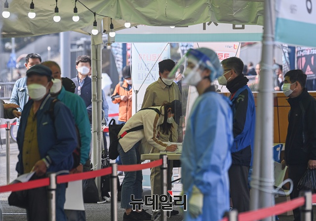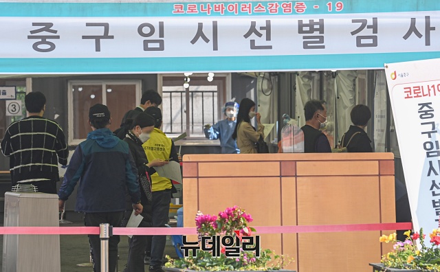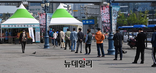 '코로나19(중국 우한 폐렴)' 신규 확진자가 698명 발생한 15일 오전 서울 중구 서울역 인근에 마련된 임시선별검사소를 찾은 시민들이 검사를 받기 위해 줄을 서 있다.