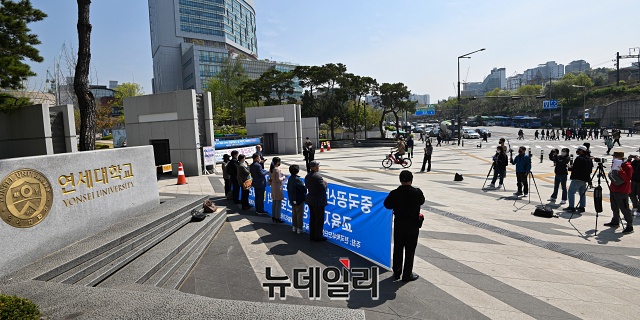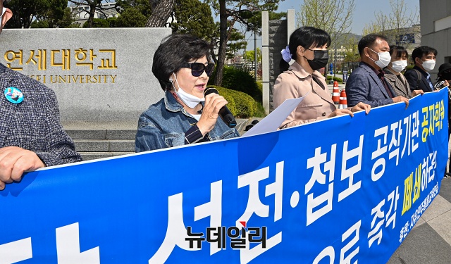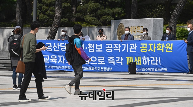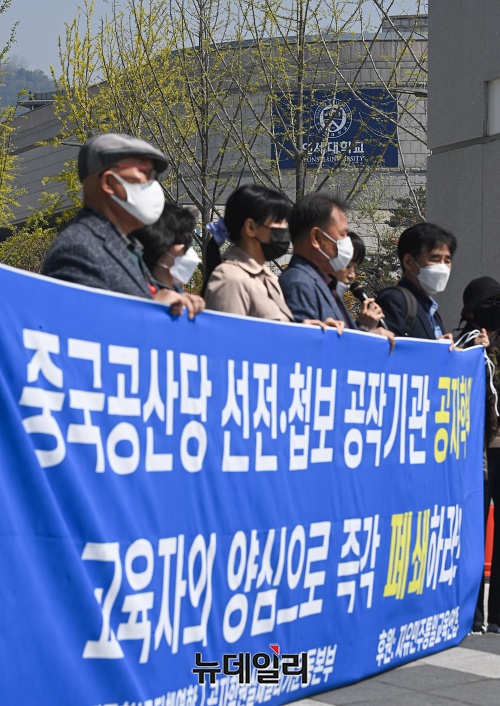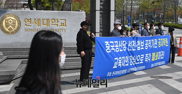 전국학부모단체연합, 공자학원실체알리기운동본부가 15일 오전 서울 서대문구 연세대학교 정문 앞에서 ‘공자학원 폐쇄 촉구 기자회견’을 갖고 있다.공자학원은 중국정부가 자국의 언어와 문화 등을 세계 전파 목적으로 세계 각국의 대학을 중심으로 설치한 교육기관이다. 서울에 연세대, 경희대, 외국어대, 한양대 등에 설치돼있다.이들은 "전국 22개 대학에 산재해있는 공자학원이 중국공산당의 선전대 노릇을 하고 있다"며 "22개 대학 총장들이 교육자의 양심으로 공자학원을 폐쇄할 것을 촉구한다"라고 말했다.