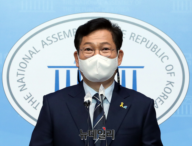 송영길 더불어민주당 의원이 15일 오후 국회 소통관에서 당 대표 출마선언 기자회견을 하고 있다.(사진=공동취재단)