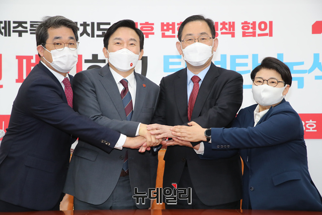 주호영 국민의힘 대표 권한대행, 원희룡 제주특별자치도지사 및 참석자들이 15일 국회에서 열린 국민의힘-제주특별자치도 '기후 변화' 정책 협의에서 기념촬영을 하고 있다. (사진=국민의힘)
