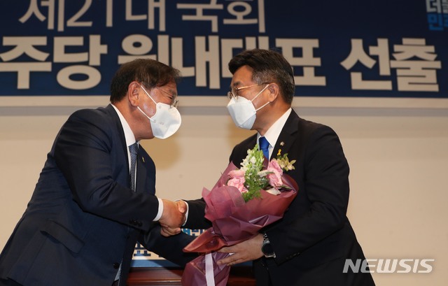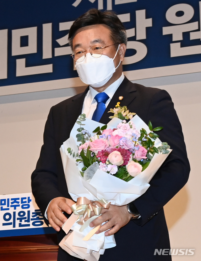 더불어민주당 신임 원내대표로 선출된 윤호중 의원이 16일 서울 여의도 국회의원회관 대회의실에서 열린 '21대 국회 제2대 더불어민주당 원내대표 선출 의원총회'에서 당선 소감을 밝히고 있다. (사진=공동취재단)