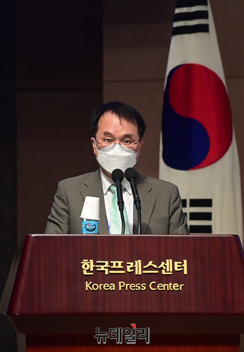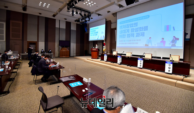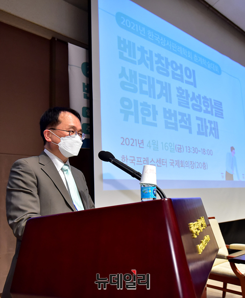 권재열 한국상사판례학회장이 16일 오후 서울 중구 프레스센터 국제회의장에서 '벤처창업의 생태계 활성화를 위한 법적 과제'를 주제로 한 2021년 한국상사판례학회 춘계학술대회에서 개회사를 하고 있다.