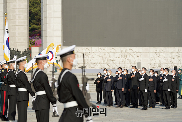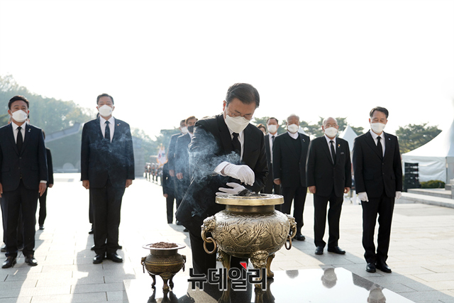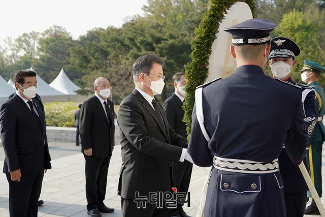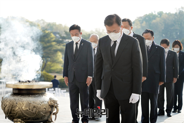 문재인 대통령이 19일 오전 서울 강북구 국립 4.19 민주묘지를 찾아 참배하고 있다. (사진=청와대)