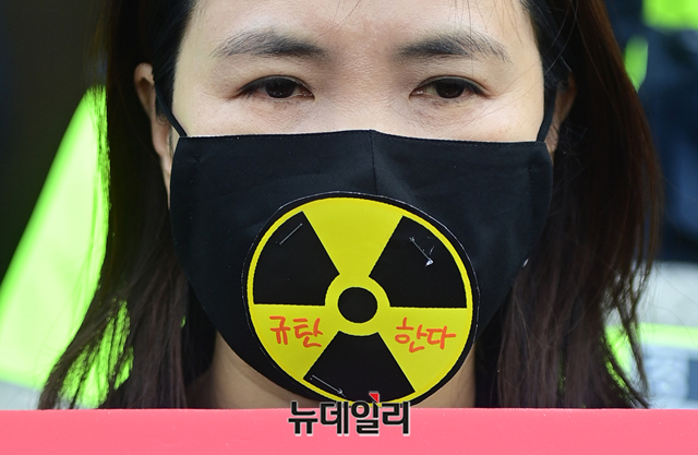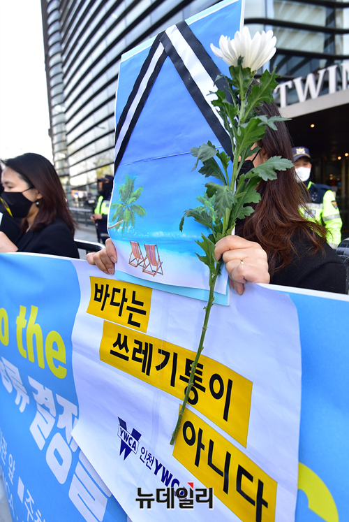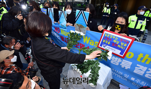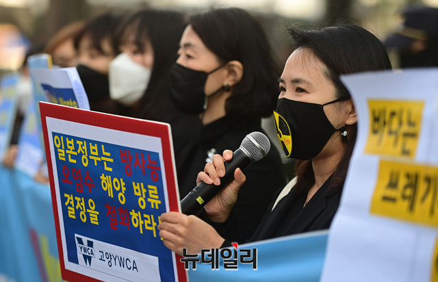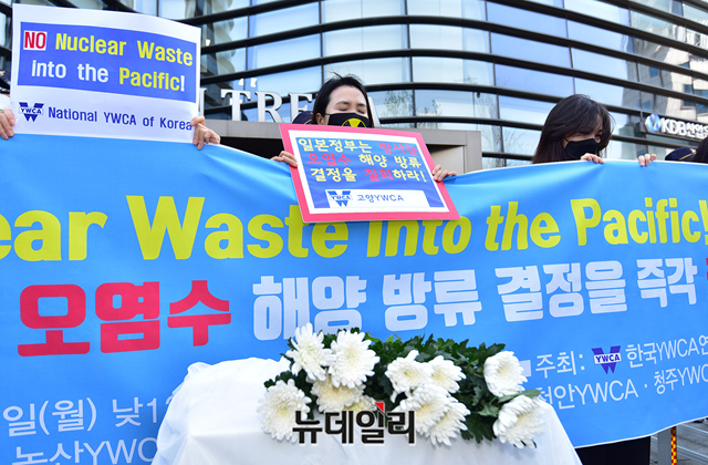 YWCA연합회가 19일 정오 서울 종로구 일본대사관 입구에서 최근 방사능 오염수 방류를 결정한 일본 정부를 규탄하는 기자회견을 갖고 있다.