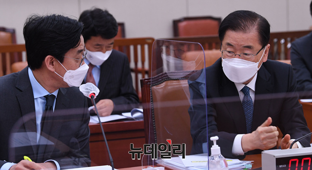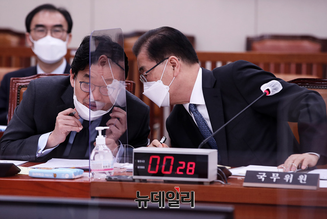 정의용 외교부 장관이 20일 오전 국회 외교통일위원회에서 열린 후쿠시마 오염수 방출과 관련한 국회 긴급현안보고에서 최종문 2차관과 대화를 나누고 있다. (사진=공동취재단)