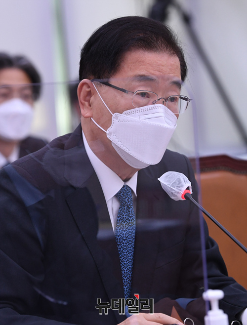 정의용 외교부 장관이 20일 오전 국회 외교통일위원회에서 열린 후쿠시마 오염수 방출과 관련한 국회 긴급현안보고에 출석해 의원들의 질문에 답하고 있다. (사진=공동취재단)