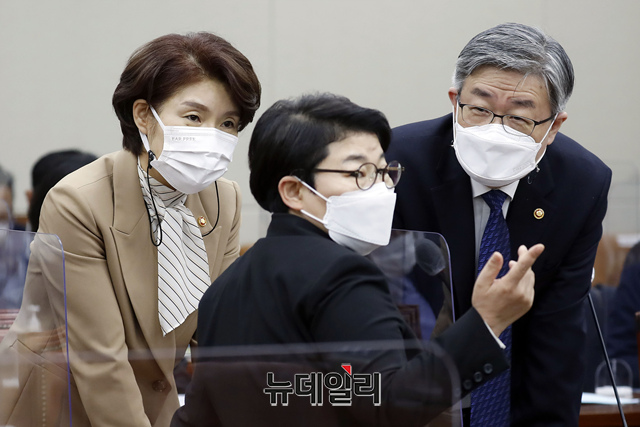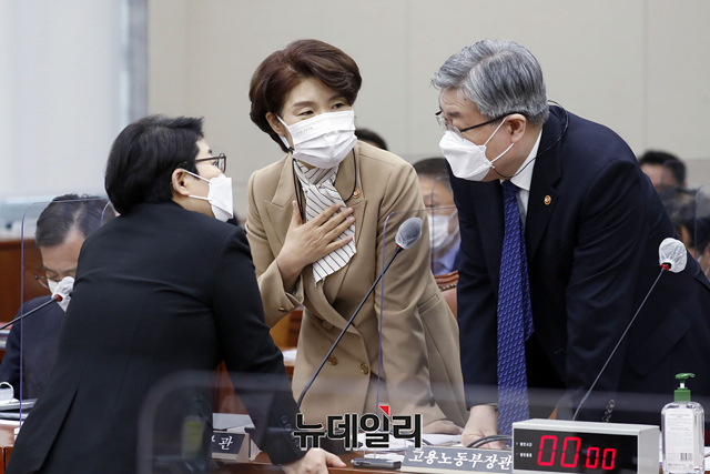한정애 환경부 장관과 이재갑 고용노동부 장관이 20일 오전 국회에서 열린 환경노동위원회 전체회의에 출석해 임이자 야당 간사와 대화하고 있다. (사진=공동취재단)
