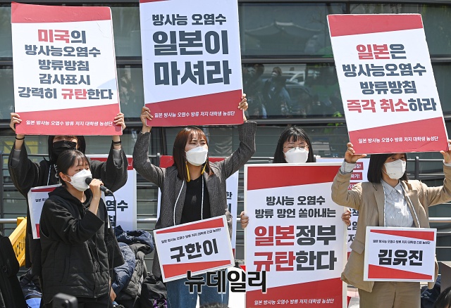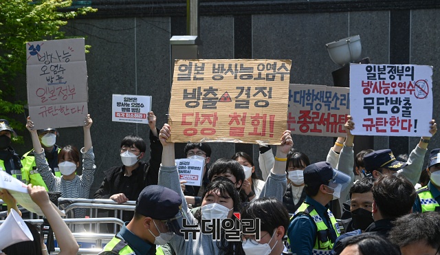 한국대학생진보연합이 20일 오후 서울 종로구 일본대사관 앞에서 일본 방사능 오염수 방류 결정을 규탄하며 집단삭발을 하고 있다.