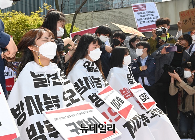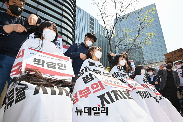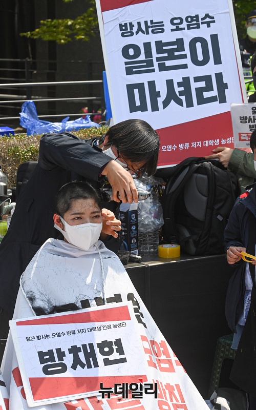 한국대학생진보연합이 20일 오후 서울 종로구 일본대사관 앞에서 일본 방사능 오염수 방류 결정을 규탄하며 집단삭발을 하고 있다.