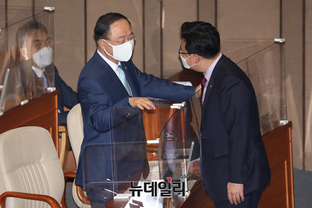 홍남기 국무총리 직무대행이 20일 오후 국회 본회의장에서 열린 경제 분야 대정부질문에 출석해 의원들과 인사를 나누고 있다. (사진=공동취재단)