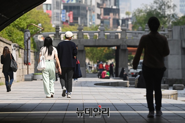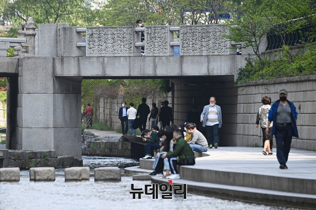 절기상 봄비가 내려 백곡을 기름지게 한다는 '곡우(穀雨)'인 20일 오전 서울 중구 청계천에서 시민들이 겉옷을 벗고 이동하고 있다. 기상청은 낮에 따뜻한 남풍이 불면서 전국 대부분 지역이 20도 이상으로 오른다고 예보했다.