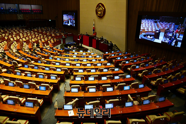 국민의힘 의원들이 20일 오후 서울 여의도 국회 본회의장에서 열린 경제 분야 대정부질문에서 김상희 국회부의장의 전날 발언에 대해 사과를 요구하며 퇴장하고 있다.