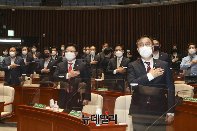 주호영 국민의힘 대표 권한대행 및 의원들이 21일 오후 국회에서 열린 의원총회에서 국민의례를 하고 있다. (사진=국민의힘)