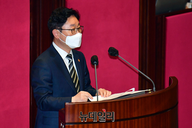 박범계 법무부 장관이 21일 오후 국회에서 열린 본회의 교육·사회·문화에 관한 대정부질문에 앞서 횡령·배임 혐의를 받고 있는 이상직 무소속 의원에 대한 체포동의요청 이유설명을 하고 있다. (사진=공동취재단)