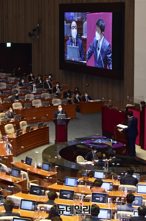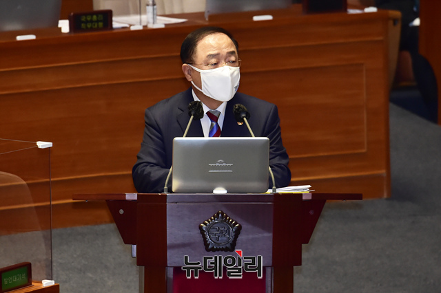 홍남기 국무총리 직무대행이 21일 오후 국회에서 열린 교육·사회·문화 분야 대정부질문에서 의원들의 질문에 답하고 있다. (사진=공동취재단)