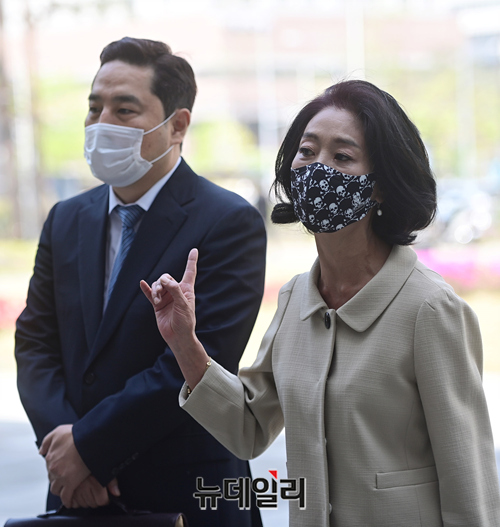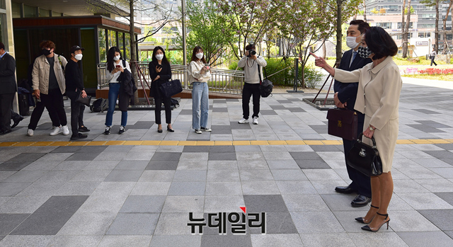 배우 김부선과 강용석 변호사가 21일 오후 서울 송파구 동부지방법원으로 이재명 경기지사를 상대로 낸 손해배상 청구소송 재판에 출석하며 입장을 밝히고 있다.