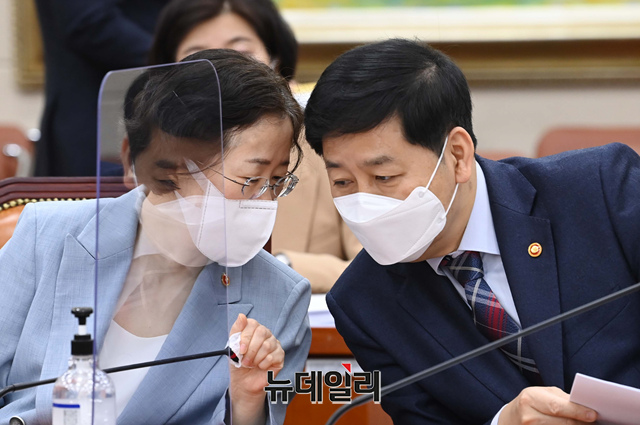 조성욱 공정거래위원장과 구윤철 국무조정실장이 22일 오전 국회에서 열린 정무위원회 전체회의에서 대화를 하고 있다. (사진=공동취재단)