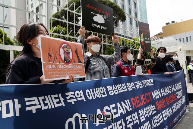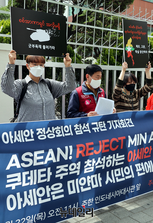 미얀마 민주주의를 지지하는 한국시민사회단체가 22일 오전 서울 영등포구 주한 인도네시아대사관 앞에서 미얀마 군사정권 최고 책임자인 흘라잉 최고사령관의 아세안 정상회의 참석을 규탄하는 기자회견을 갖고 있다.