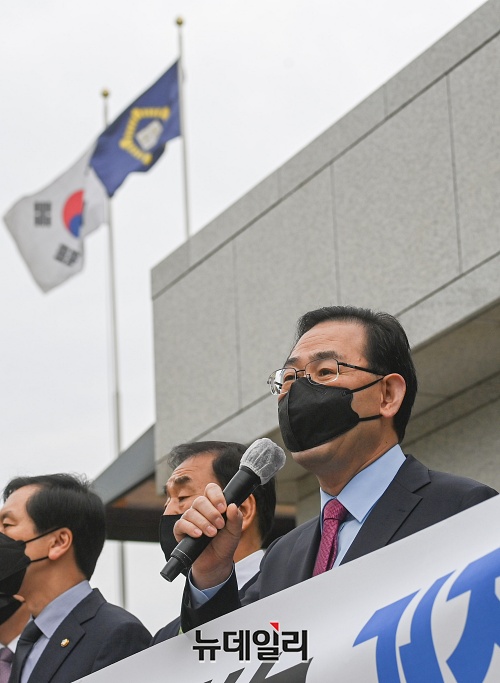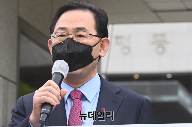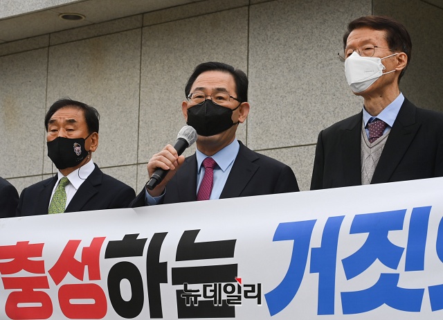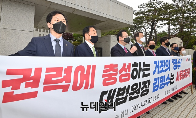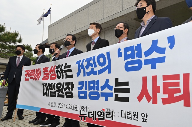 주호영 국민의힘 대표 권한대행이 23일 오전 서울 서초구 대법원 앞에서 열린 김명수 대법원장 사퇴촉구 기자회견에서 발언하고 있다.이들은 "김명수 대법원장은 사법부 수장으로서 사법부의 독립을 수호하기는커녕, 정권의 하수인 노릇을 자처해 법치주의 파괴에 앞장서고 있다"라며 "법의 날 전 즉각 사퇴할 것을 촉구한다"고 말했다.제58회 법의날을 맞아 열린 기자회견에는 주호영 국민의힘 대표 권한대행을 비롯한 국민의힘 법사위 소속 의원, 이재오 비상시국연대 대표 등이 참석했다.